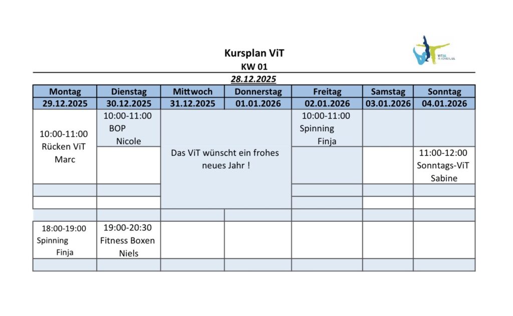 Kursplan für die KW 01 2026 (aktualisiert am 28.12.2025)
